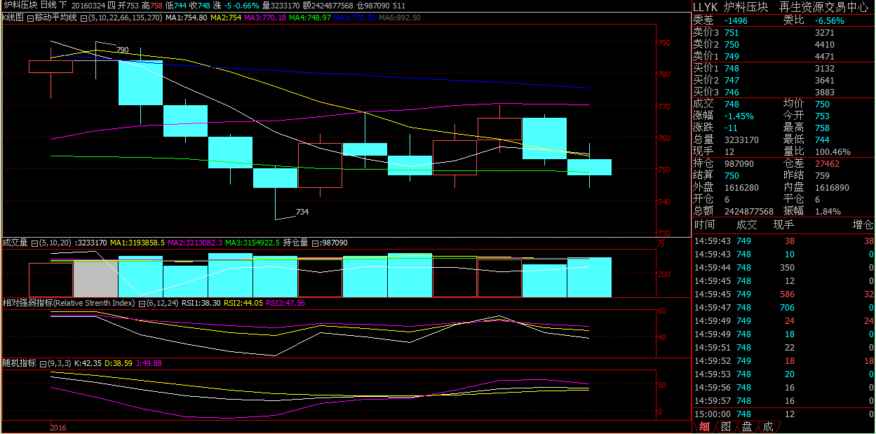 重庆再生资源交易中心 炉料压块(LLYK)收评:今开753、收748、最高758、最低744,跌11点,跌幅1.45%。